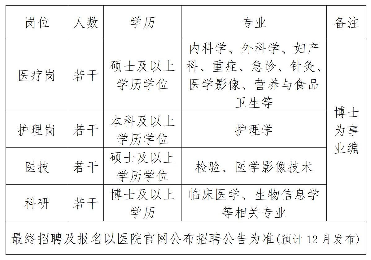 医院长期招聘内科、外科、急诊、重症、护理等专业技术人员和各类高层次人才。医院具有完善的人才培养、岗位晋级等机制,提供有竞争力的科研奖励和薪酬待遇。医院鼓励职工进行继续医学教育培训,对于博士等高层次人才进院后配备相应人才启动经费。