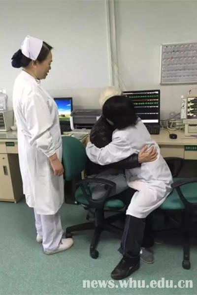 ▲图中老人的老伴在综合病房治疗了9个月,本月17号因肺癌去世。金雅磊不断安慰老人。老人与她拥抱了半个小时,表达对中南医疗团队的感谢。