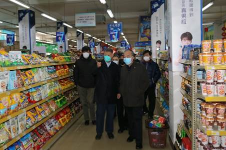 在工学部自强超市,校领导一行检查了物资供应情况,认真询问蔬菜等生活物资储备、调运等物资供应保障情况,并与超市经理、收银员交谈情况。当了解到,自强超市按校区开通了四个留校学生服务微信群,并为留校学生提供免费送货上门服务时,窦贤康为超市关爱学生的周到服务点赞。