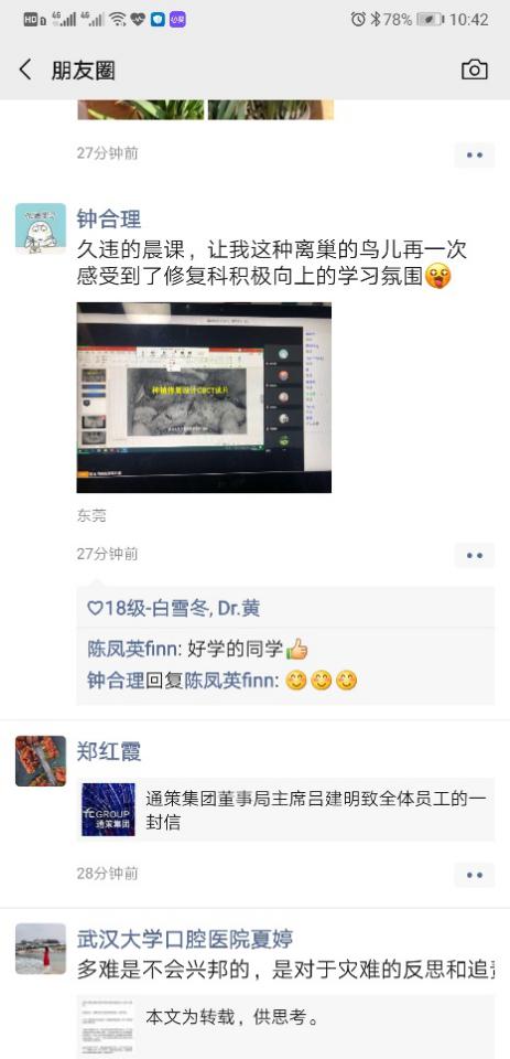 不少学生课后发表感言,“今天的晨课是特别的,因为我们跨越了地域,第一次在线上完成修复晨课。”“今天的晨课很特别,既有在读同学,也有已经毕业的规培学员重回集体。”“不能走上抗击疫情一线的我们,要铭记医生的使命,学好知识,将来为患者服务!”