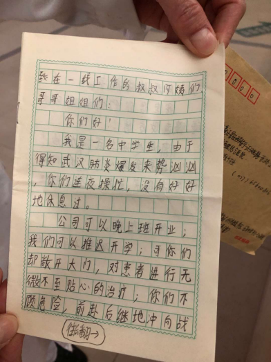 2月8日,中西医结合医院收到了一封信,信封上用稚嫩的笔迹写着“张继先收”。这封信来自广州市五羊中学一位中学生。“公司可以晚上班开业,我们可以推迟开学,可你们却敞开大门,对患者进行无微不至贴心的治疗,你们不顾危险,前赴后继地冲向战场……武汉加油!”信封里还夹了这个孩子捐的五百元钱。