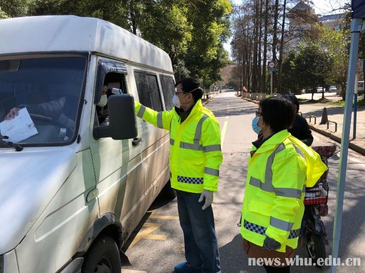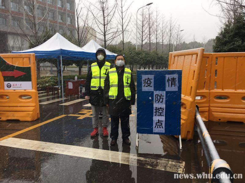 校园平安有序,他们是守护神。早在校园卡点管控任务启动前,离退休工作处副处长王临平带领十余位同志每天分片区巡查校园两次,发现有出门不戴口罩或者聚集聊天的情况及时提醒,将校园防护落实落细。校内卡点执勤启动后,突击队轮班派出20位队员,分别守在校内的5个卡点,维持校园秩序,守护师生安全。2月15日武汉突降大雪,执勤的同志全身冻透,仍然迎风立雪,坚守岗位。学校片区楼栋值守开始后,突击队员不仅做好自己片区值守工作,还积极协助人手紧缺的其他分党委开展值守,协助解决留校师生的生活困难。科发院成果平台处副处长胡浩在值班时,得知自己工作片区有退休老同志急需血糖仪,赶忙利用工作间隙跑了两家药店,最终买到并及时送到了老同志手上。
