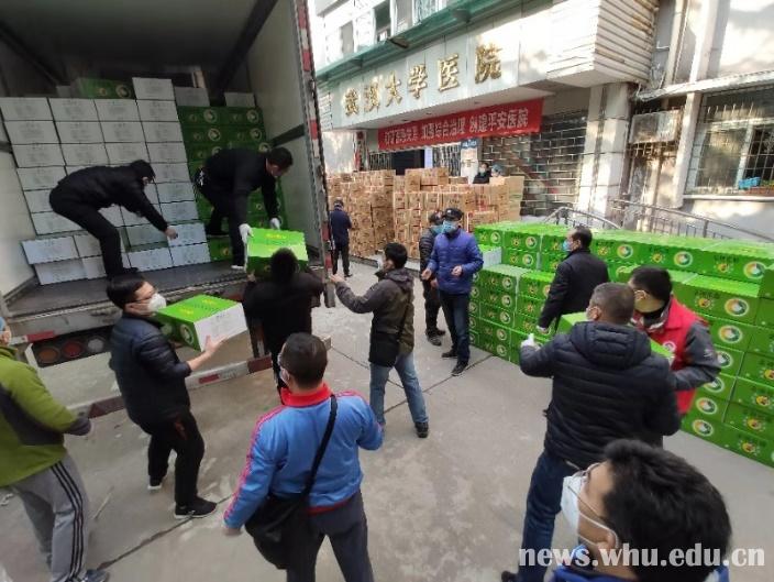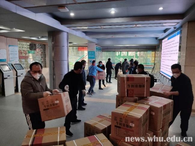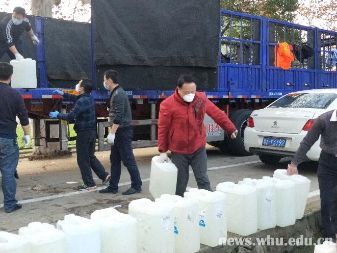 搬运抗疫物资,他们是生力军。截至目前,突击队先后出勤10余次,累计130余人次参与抗疫物资卸运。物资运输车辆通常是连夜启程,黎明到达,突击队员们也已经习惯了24小时待命、枕戈待旦的工作模式。在突击队成立的第二天,就圆满完成凌晨五点在珞珈山庄搬运物资的任务。临时接到任务通知时,校内居住的队员会首先集结,第一时间到位,校外居住的队员陆续梯队汇入,能在较短时间内凝聚成强大的战斗力量。学校接受各方物资的频次高、数量大,经常一项任务完成后没来得及休息,就要投入到下一件任务中。2月12日,学生就业指导与服务中心主任晏金柱刚刚结束扶贫点捐赠生活物资的搬卸,又马不停蹄投入到校园管理中心500桶消毒液的卸载和入库工作中。