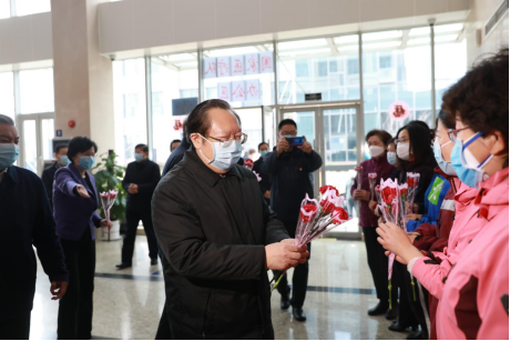 韩进还和王高华一起,为女性医护工作者现场发放了节日慰问品,并嘱咐她们奋力抗疫的同时,加强防护、劳逸结合,扎实做好医疗救治和疫情防控各项工作,彻底打赢疫情防控的人民战争、总体战、阻击战。