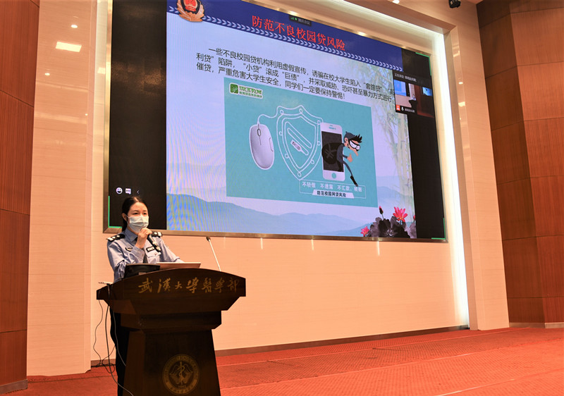 珞珈山街派出所民警钟怡做安全教育讲座。她通过诸多实际案例,提醒同学们要警惕冒充客服或熟人、网络刷单、伪基站短信等新型电信诈骗,做到“不轻信、不透露、不转账”,不断提升防范意识和防范能力。随后她介绍了不良校园贷的风险和常见圈套,希望同学们树立正确的消费观,远离不良校园贷。最后,她介绍了基本的交通知识,呼吁同学们主动遵守交通法规,保护人身安全。