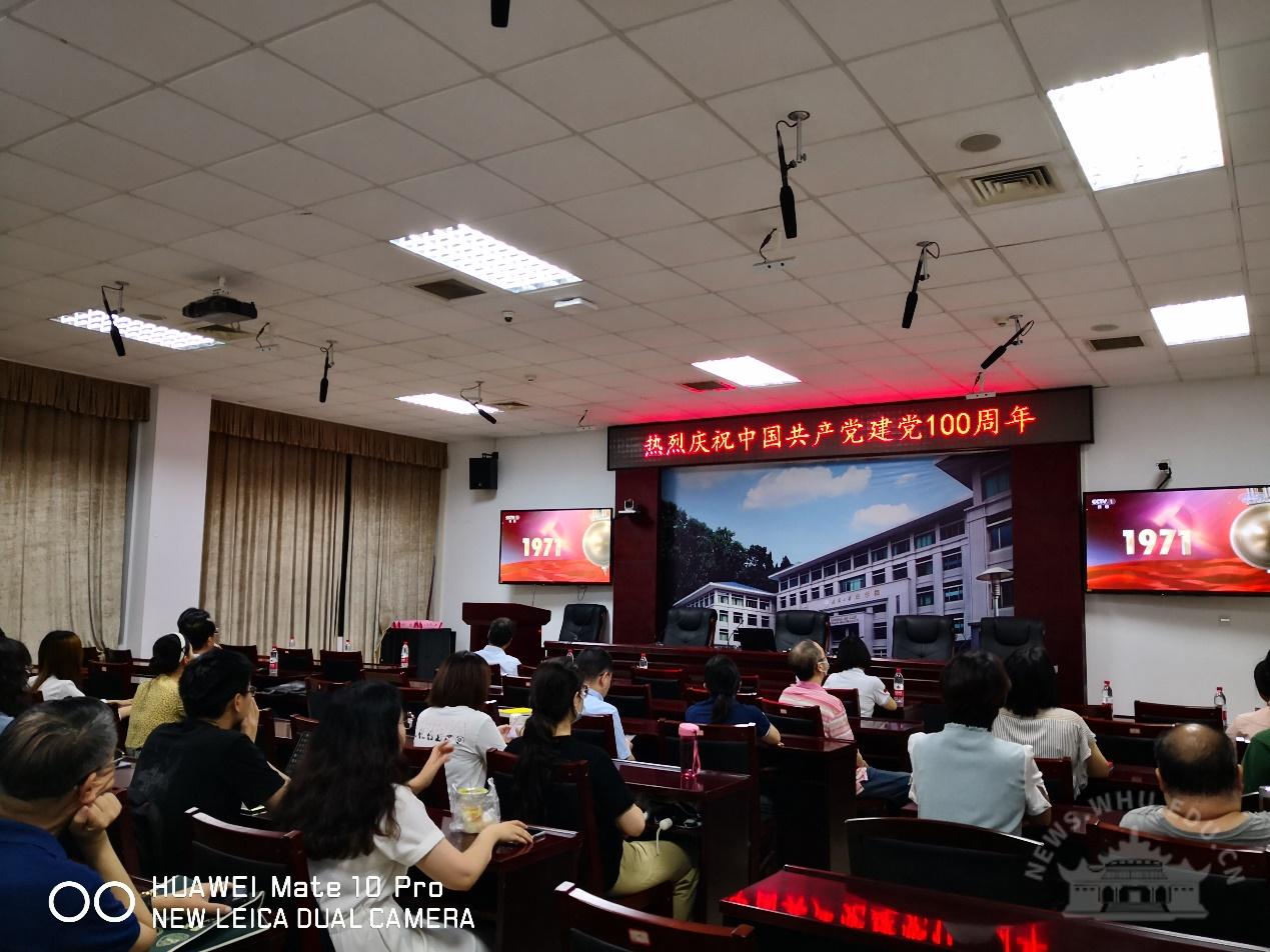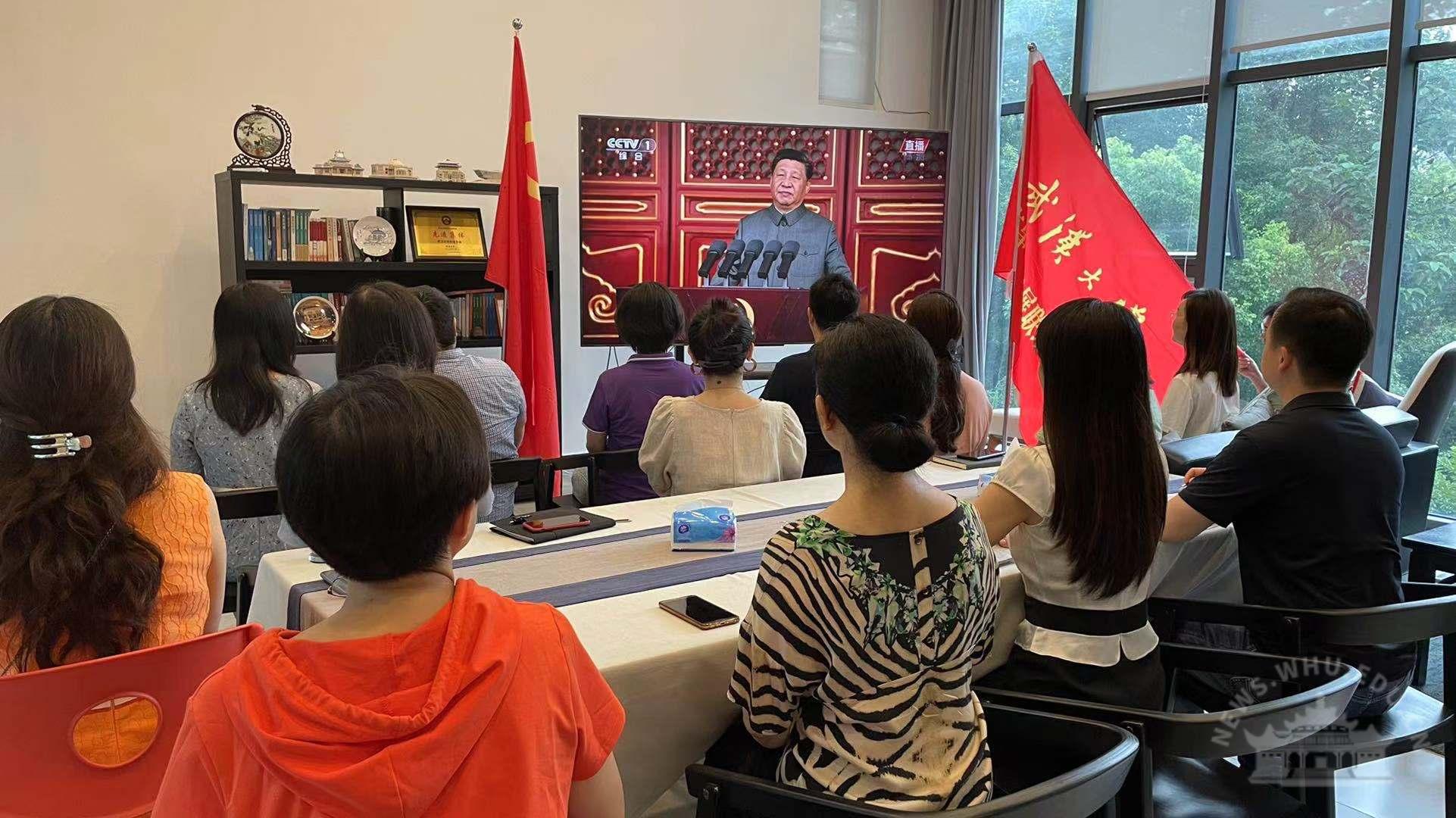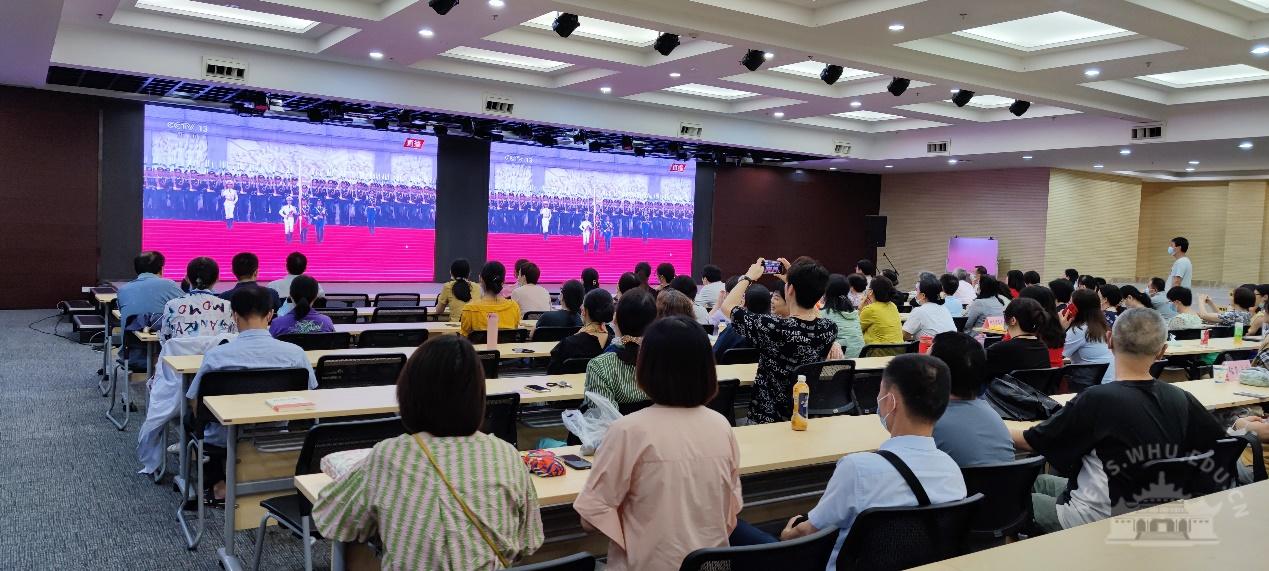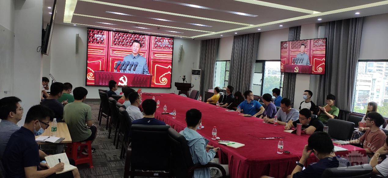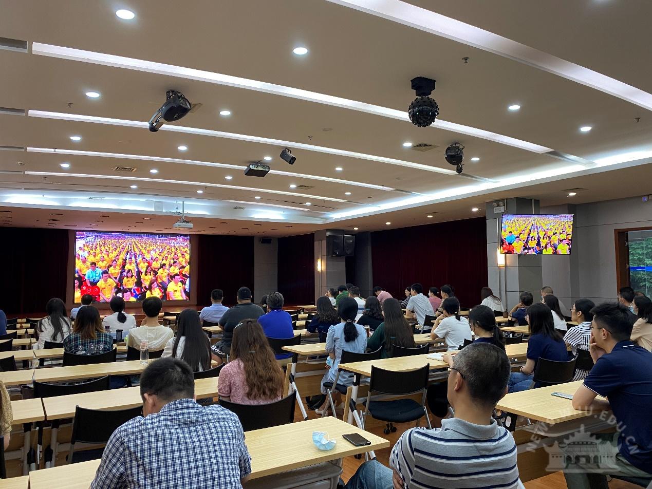 中央党史学习教育中管高校第十指导组组长欧可平等全体成员,校党委书记韩进,校党委副书记、校长窦贤康等全体在校的校领导,各分党委(党总支)书记、机关与直属单位党委下属各单位主要负责人在行政楼主会场全程观看庆祝大会直播盛况,各二级单位组织党员干部、师生员工在分会场观看庆祝大会。