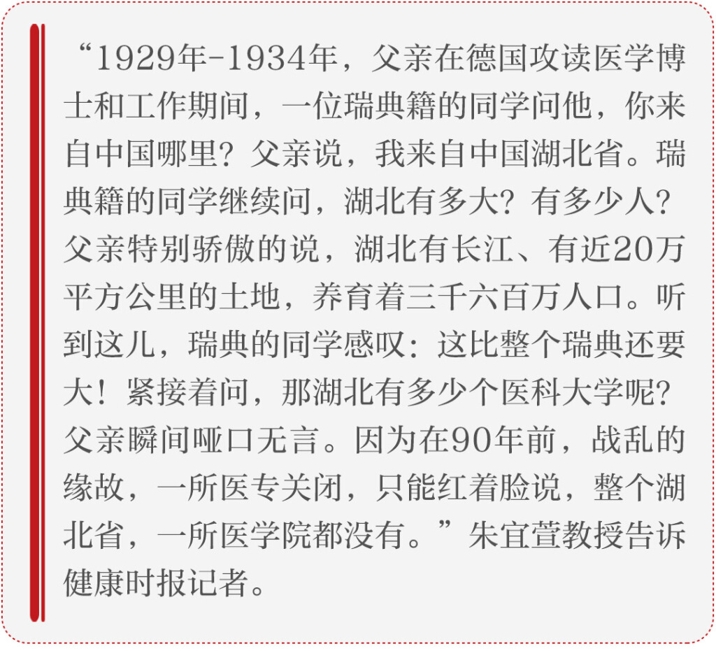 1929年-1934年,父亲在德国攻读医学博士和工作期间,一位瑞典籍的同学问他,你来自中国哪里?父亲说,我来自中国湖北省。瑞典籍的同学继续问,湖北有多大?有多少人?父亲特别骄傲的说,湖北有长江、有近20万平方公里的土地,养育着三千六百万人口。听到这儿,瑞典的同学感叹:这比整个瑞典还要大!紧接着问,那湖北有多少个医科大学呢?父亲瞬间哑口无言。因为在90年前,战乱的缘故,一所医专关闭,只能红着脸说,整个湖北省,一所医学院都没有。