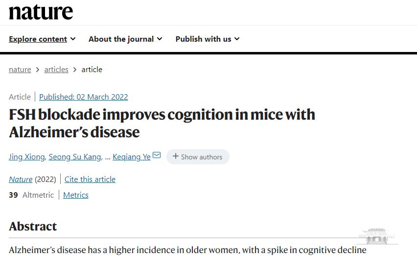 人民医院神经内科熊婧副主任医师为第一作者的研究论文《抑制卵泡刺激素的作用可以改善阿尔茨海默病小鼠的认知功能障碍》(“FSH blockade improves cognition in mice with Alzheimer’s disease”)。该项研究成果在全世界首次揭示了卵泡刺激素是老年女性更易患阿尔茨海默病的原因,为该病的早期筛查和干预提供了新方案。