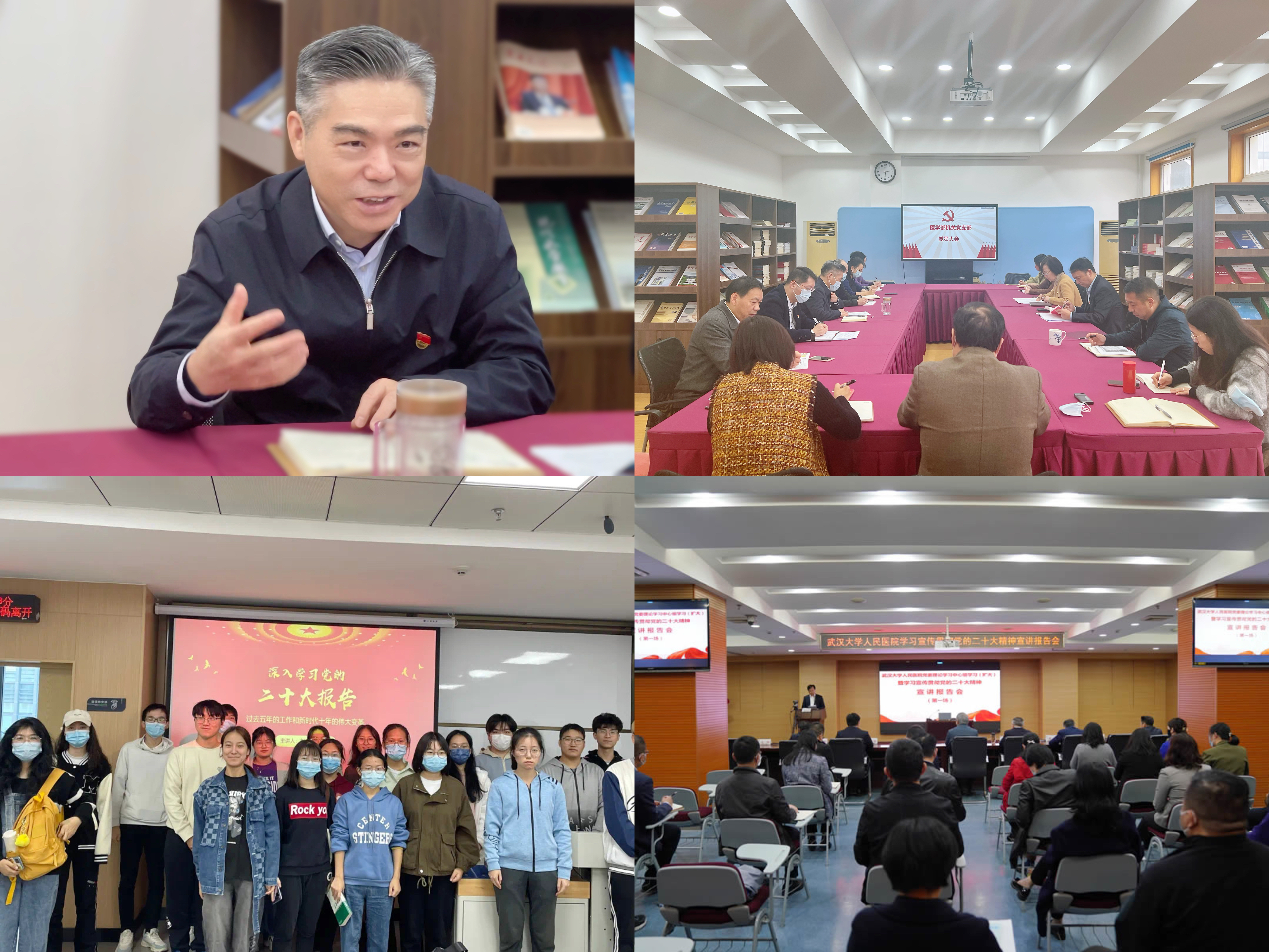 机关理论学习中心组集中学习党的二十大精神,部领导分享学习感悟。泰康医学院(基础医学院)举办“学习党的二十大精神”主题党日、主题团日活动;公共卫生学院举行党的二十大精神专题辅导讲座;护理学院党委书记讲授党的二十大精神专题党课;人民医院举办学习宣传贯彻党的二十大精神首场宣讲报告会,邀请省委宣讲团成员邹德文教授作辅导报告;中南医院联合湖北电视台大健康发展中心出品6集纪录片《基层里的大医生》。