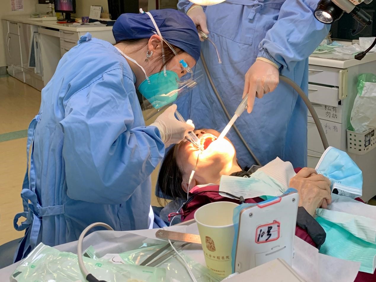 在治疗病房收治的口腔恶性肿瘤病人时,他们积极站出来,即便是阳性或疑似阳性的病人,也全程参与手术及术后的康复治疗。12月8日,科室完成了一例“口底恶性肿瘤切除+血管化游离皮瓣转移缺损修复”的手术,叶宇勋同学与带教老师一起,全程参与手术。