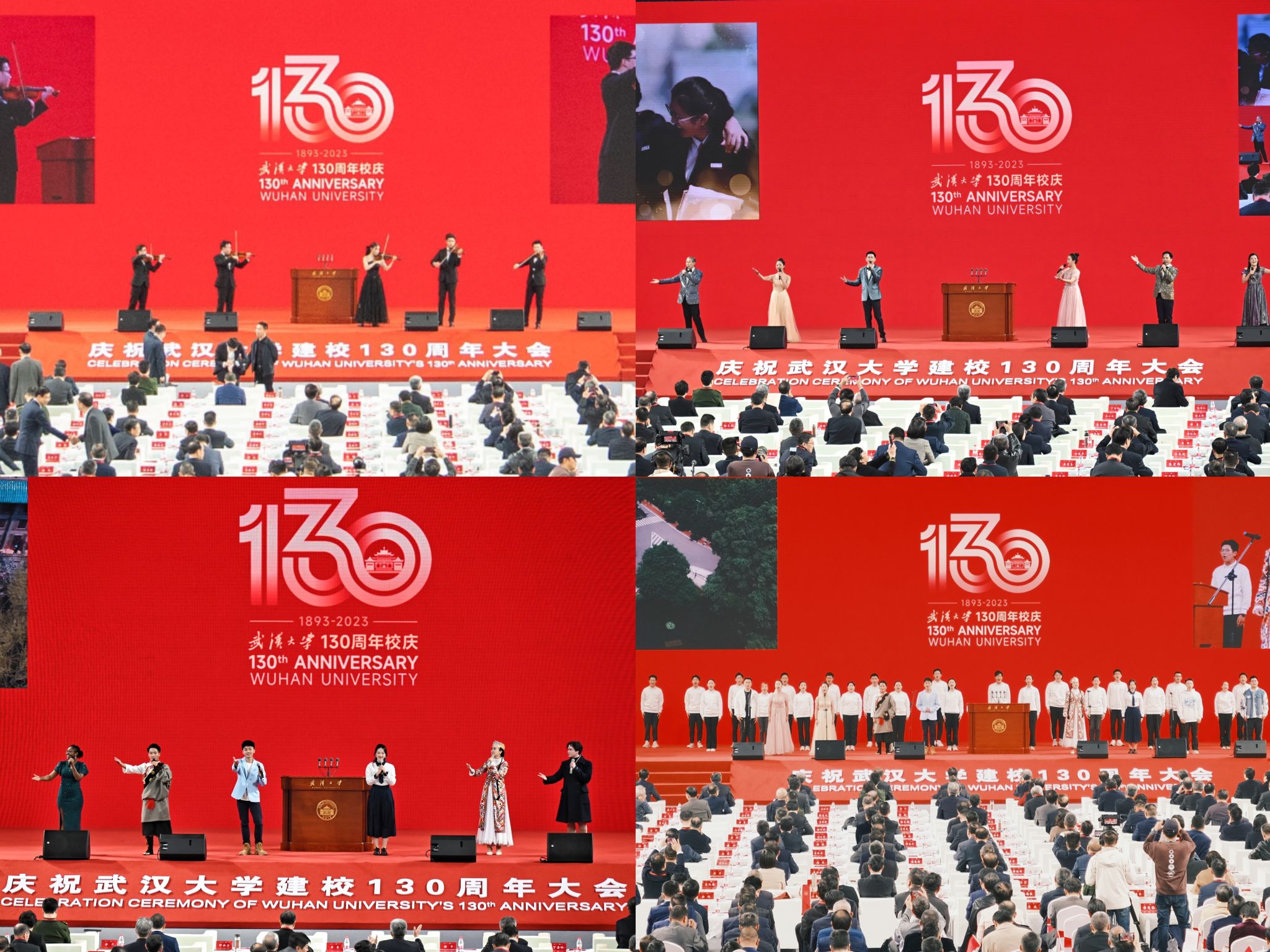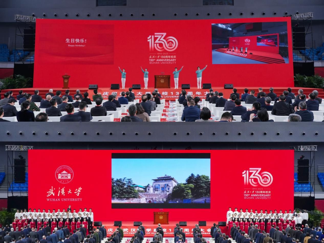 上午9时,卓尔体育馆内气氛热烈,嘉宾云集。大会开始前,屏幕上播放着校友代表、国际组织和国内外高校发来的祝福视频和贺信贺电,参与中国第40次南极科考的武大人从“雪龙”号发来特别的祝福。会场内,小提琴演奏《祝你生日快乐》,快闪联唱《年轻的朋友来相会》《在这里的时光每天都很耀眼》《百卅》《有我》。武大师生齐上阵,用歌声展现昂扬风采,彰显决心担当,献礼百卅珞珈。