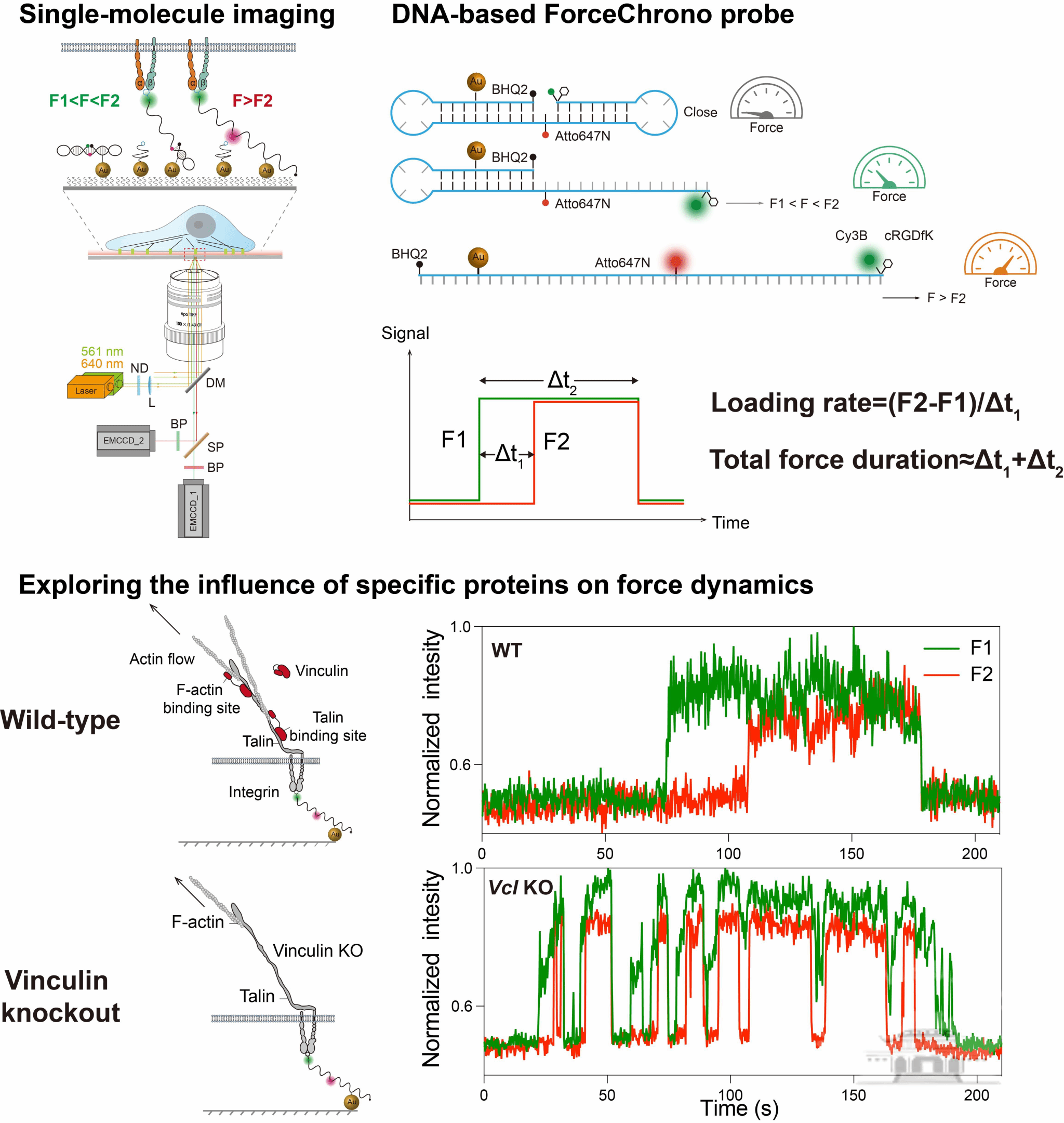 机械力在细胞信号传导中扮演着与传统生化和电生理信号不同的重要角色。由于细胞表面受体传递的力非常微小,仅有几个到几十pN,其动态特征使测量极为困难。除了力的大小,力的持续时间和加载速率也对细胞信号转导和行为有深远影响。力的持续时间决定了信号传导的时长,而加载速率影响蛋白的展开和激活,如此前文献估算及体外实验中的力学加载速率范围非常广,从0.007到10^6pN/s不等,对活细胞中力传递持续时间的信息了解更为缺乏,导致研究人员在解释现象时需要粗略假定速率或持续时间,造成对细胞力学传导理解的混乱。