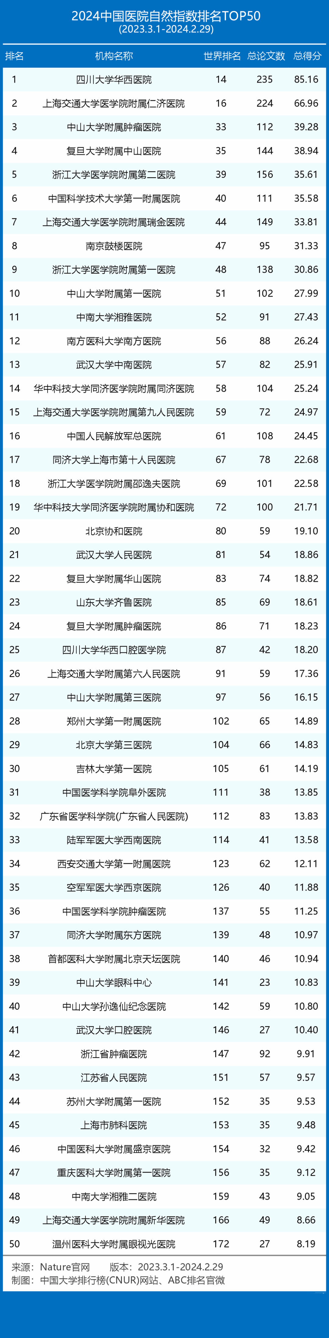 此次公布的榜单是基于2023年3月1日至2024年2月29日的统计数据。经统计,全球共有5293所医疗机构上榜,主要来自中国(986所)、美国(875所)、日本(378所)、德国(292所)、意大利(219所)、法国(195所)、英国(193所)、西班牙(170所)以及印度(127所)。全球医疗机构自然指数排名百强中,美国(42所)、中国(27所)、荷兰(9所)、德国(7所)等国家位居前列。
