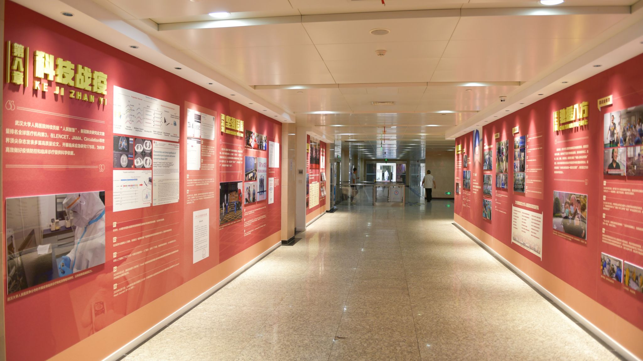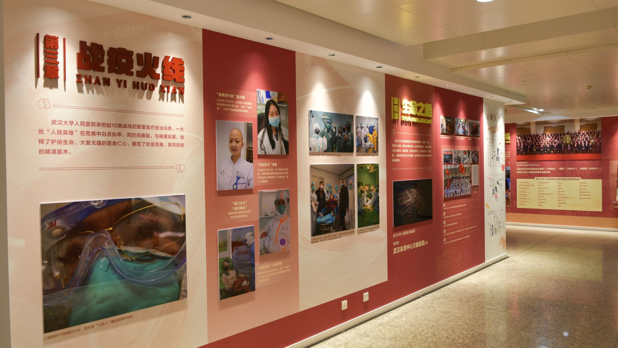 人民医院东院区2号楼1楼大厅,精心汇集了超过百幅珍贵图片,由党建引领、一线指导、战疫火线、生命之舱、病毒猎手、超级医院、驰援八方、科技战疫、坚强后盾、人民群英等10个章节组成,全面呈现了作为“武汉保卫战”中流砥柱的快猫短视频