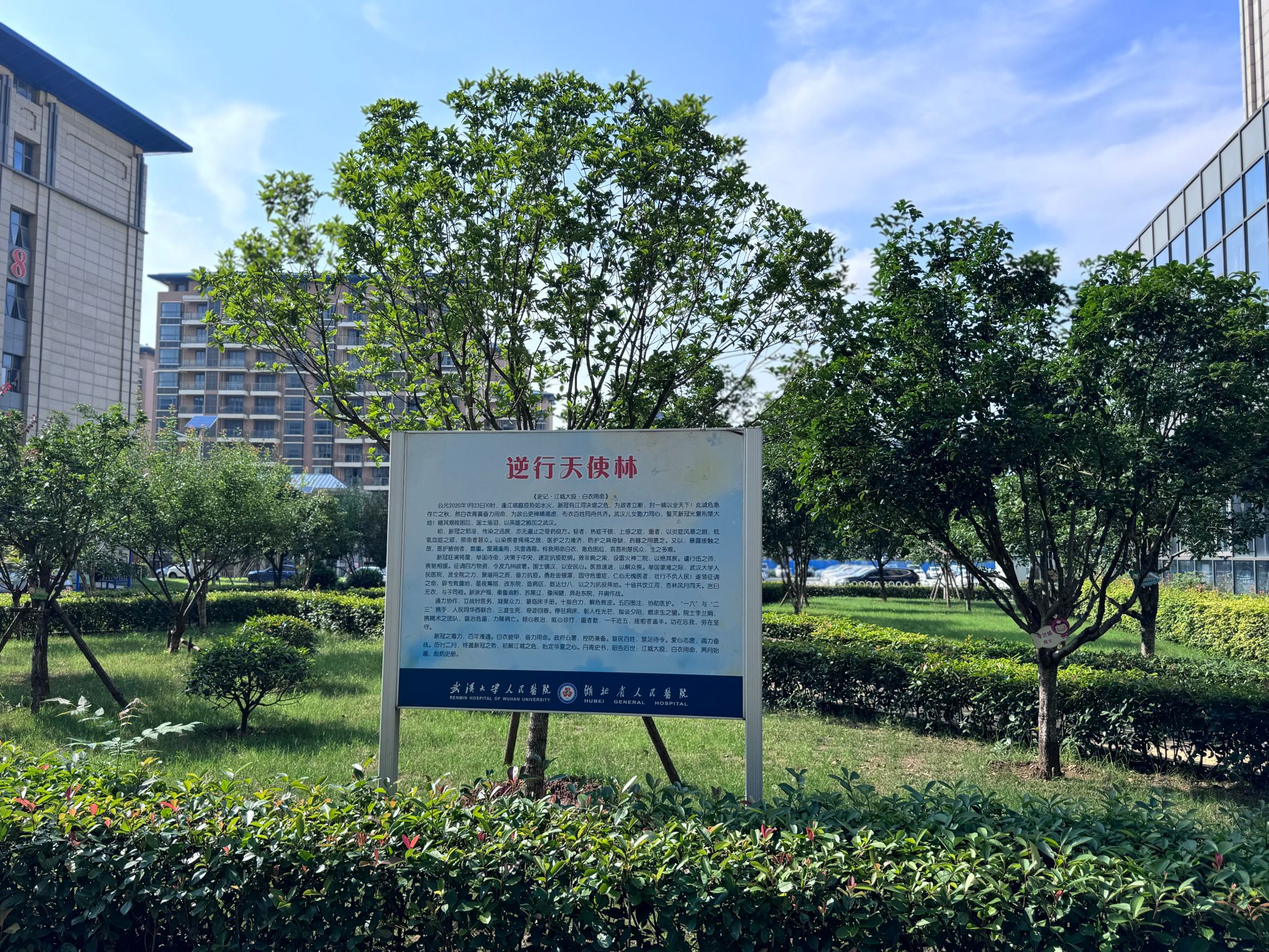 人民医院医护人员一起,在该院东院区,共同栽下了一片由寓意“贵人”的桂花树组成的“感恩林”。它是武汉感恩全国人民、特别是全国各地逆行的白衣天使们倾力支持的生动体现。四年过去,这片“感恩林”郁郁葱葱,生机勃发。