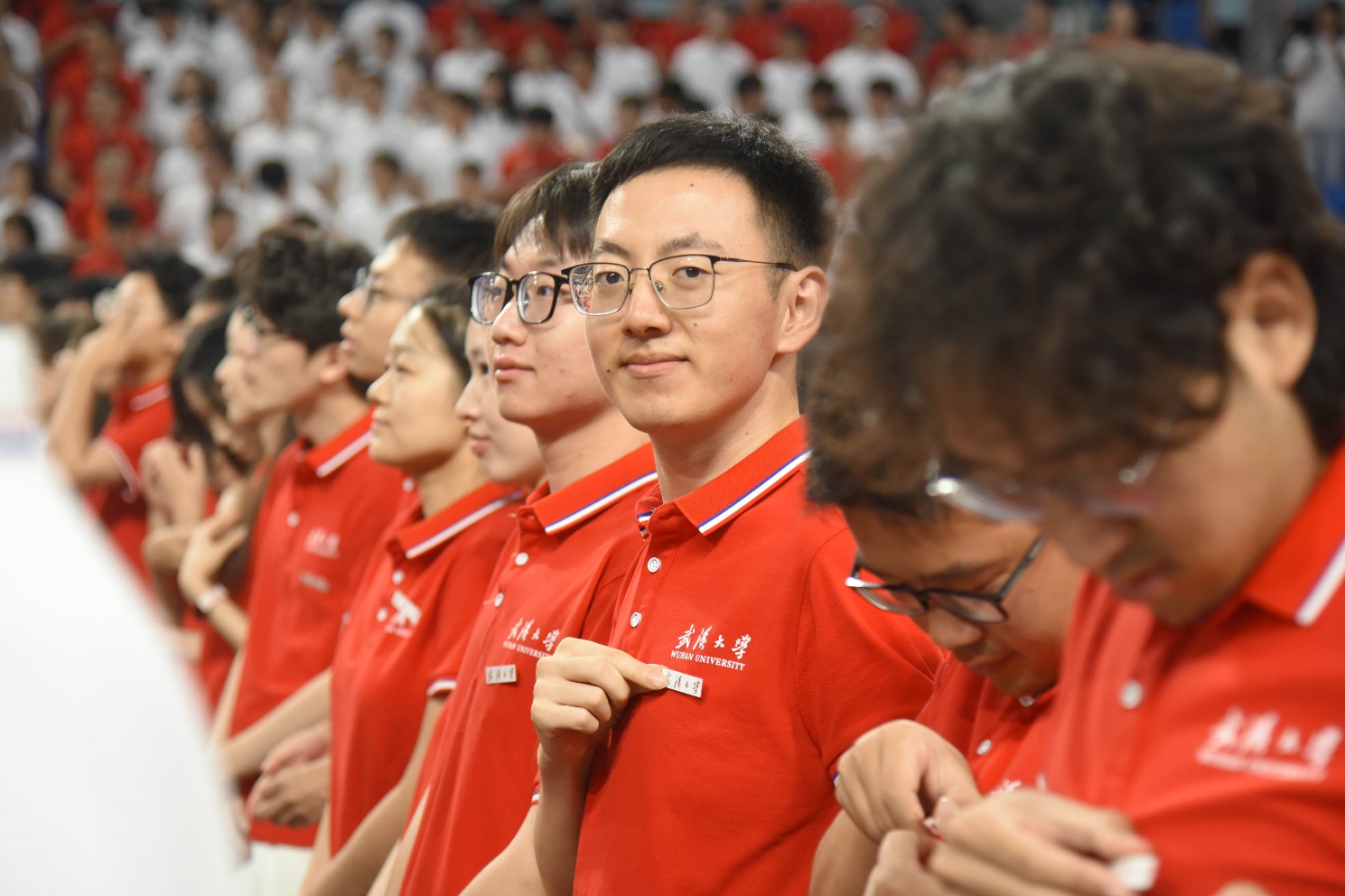 “接过万千热血的初衷,当有对答世界的音量”,青春洋溢的歌曲串烧在卓尔体育馆响起,瞬间点燃同学们的万千热情。在采访互动环节,同学们慷慨激昂,立下“要把论文写在祖国大地上”的豪迈誓言。随后,鲜艳的巨幅五星红旗缓缓展开,李德仁院士带领大家唱响《祖国不会忘记》,此刻歌声与国旗交织成一幅壮丽画卷,激励着每一位新武大人。在导师团的见证下,全体同学起立佩戴校徽,肩负起属于珞珈学子的使命和担当。