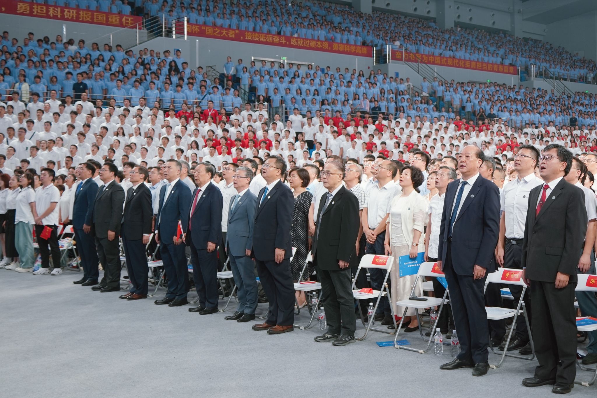 2024级本科新生开学典礼在卓尔体育馆举行,在歌曲《强国一代有我在》的合唱伴奏下,学生方阵托起巨幅国旗,在新中国成立75周年之际,共同许下庄严承诺。