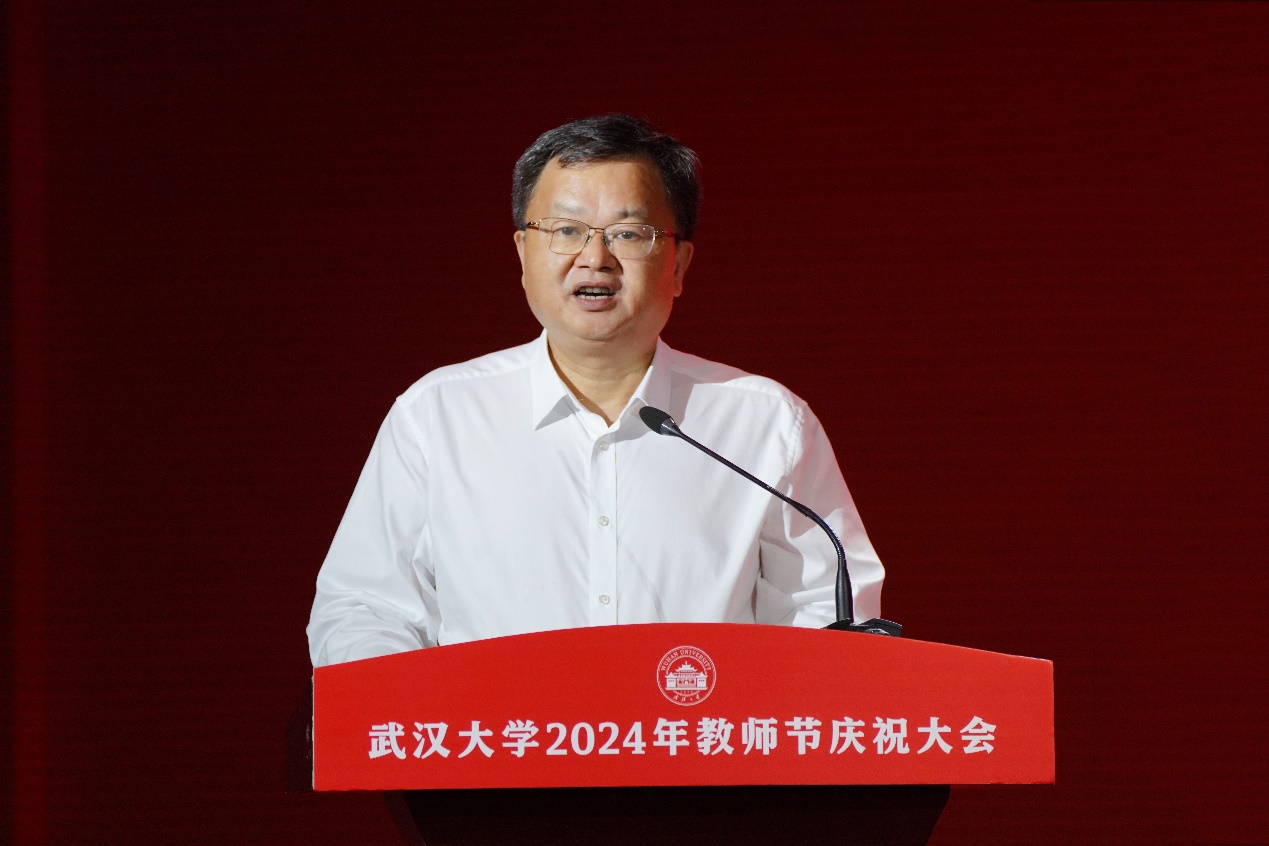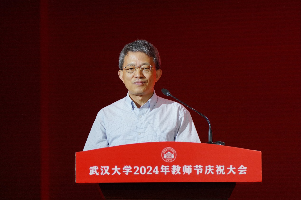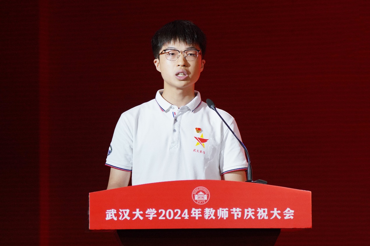 学生代表、法学院2021级本科生喻晨忻从“求真、求知、求实”三个方面讲述了武大老师带给莘莘学子的影响和启发。他提到,武大的老师是引导学生立志明德的“大先生”,是指导学生学习科研的引路者,也是教导大家躬行实践的知心人。在老师们的悉心教导下,珞珈学子将不断努力,为推进中国式现代化贡献青春力量。