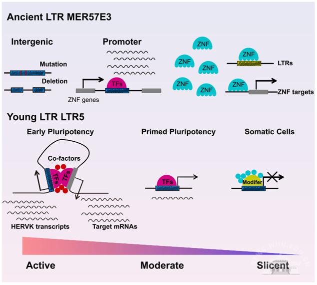 中南医院医学研究院、免疫与代谢前沿科学中心蒋卫教授课题组在人多能干细胞转录调控领域的最新成果。该研究阐明了内源性逆转录病毒元件调控宿主基因表达的两种模型:进化相对古老的MER57E3可以通过控制邻近的ZNF基因表达从而参与宿主生物学过程,而相对年轻的LTR5/LTR5_Hs更倾向于长间距相互作用调控宿主基因表达。