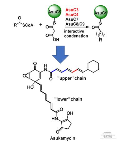 Asukamycin是结节链霉菌产生的一类聚酮化合物,结构上含有两个末端基团不同的反式三烯上下链。研究人员通过解析上链的形成机制,发现一类新的聚酮合酶。虽然该聚酮合酶与II型聚酮合酶类似,也是由多个游离的酶组成,但存在本质上的不同,其利用了一对特殊的Ketoacyl-acyl carrier protein synthase III (KAS III)同源蛋白(AsuC3,AsuC4)作为C-C键合成工具,催化合成了聚酮碳链。