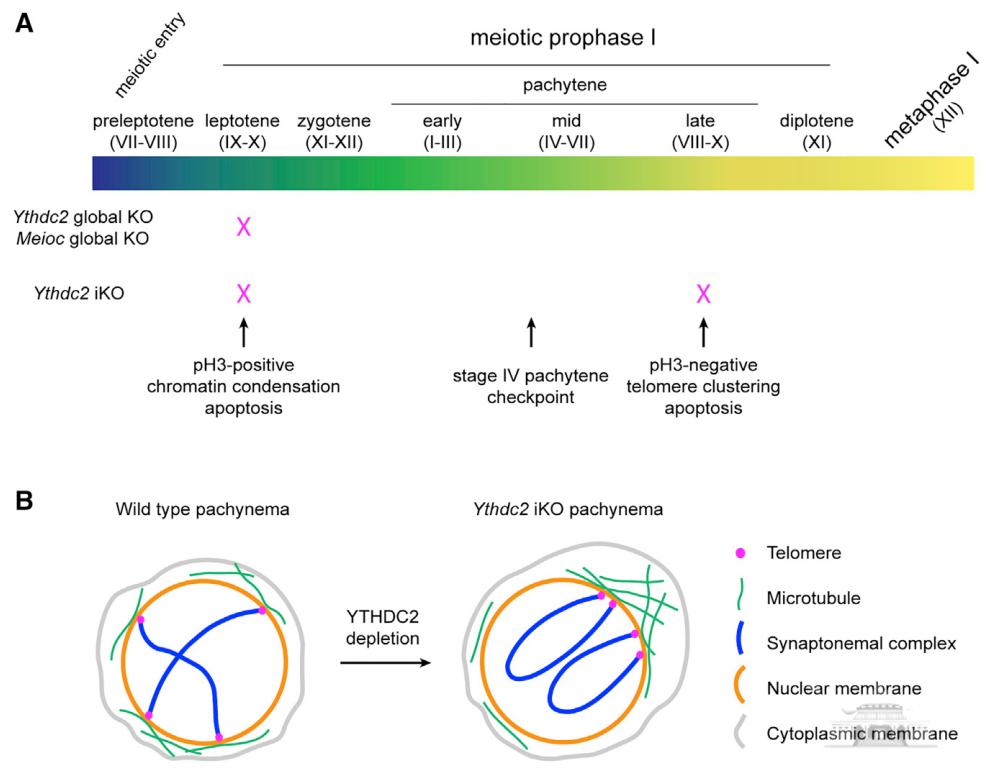 有学者通过CRISPR/Cas9等技术构建了小鼠Ythdc2全敲模型,证实Ythdc2是减数分裂必需的,Ythdc2敲除使生殖细胞进入减数分裂后阻滞在减I前期的较早阶段(类似偶线期),无法进入粗线期,过早发生类似中期的染色质凝集浓缩而凋亡。但是,很有趣并提示具有重要意义的是,YTHDC2在粗线期精母细胞中高表达,而全敲鼠模型没有回答也无法回答YTHDC2在粗线期精母细胞中可能具有的重要功能。