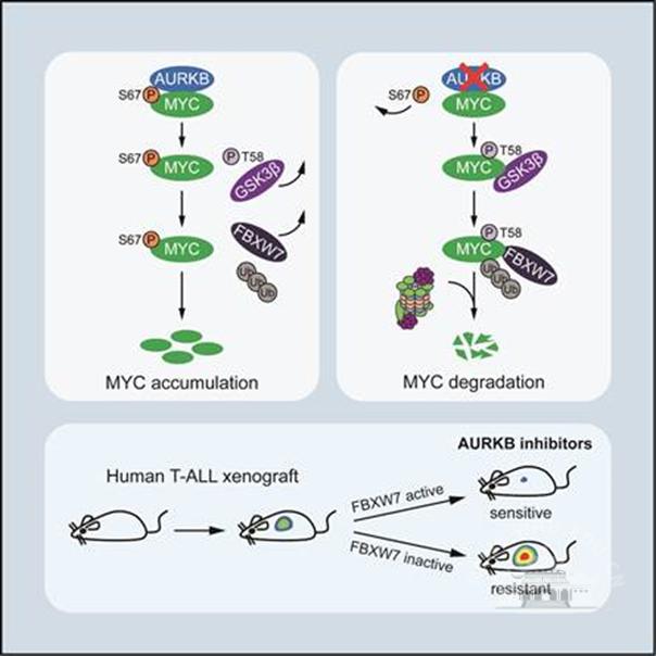 刘胡丹课题组发现了蛋白酶AURKB直接结合并磷酸化癌蛋白MYC(新型S67磷酸化修饰),并揭示其增强MYC蛋白稳定性以及促进急性T淋巴细胞白血病(T-ALL)恶性进展的功能作用。该研究为靶向抑制AURKB的抗白血病策略提供了理论依据,并提出FBXW7基因型可作为预测靶向治疗疗效的分子标志物。相关成果发表在学术期刊Cancer Cell(《癌细胞》),论文题为“Direct Phosphorylation and Stabilization of MYC by Aurora B Kinase Promote T-cellLeukemogenesis”。