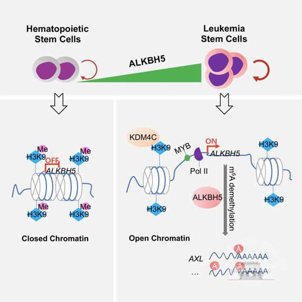 张好建课题组发现了染色质变化调控ALKBH5表达是正常造血干祖细胞向白血病干细胞演化过程中的关键事件,证实ALKBH5特异调控急性髓系白血病(AML)干细胞功能,并揭示了其作用机制。该研究发现了白血病干细胞演化的新事件,诠释了AML发生发展的新机制,为特异靶向白血病干细胞提供了潜在治疗靶点。相关成果发表在学术期刊Cell Stem Cell(《细胞•干细胞》),论文题为“LeukemogenicChromatin Alterations Promote AML Leukemia Stem Cells via a KDM4C-ALKBH5-AXL Signaling Axis”。