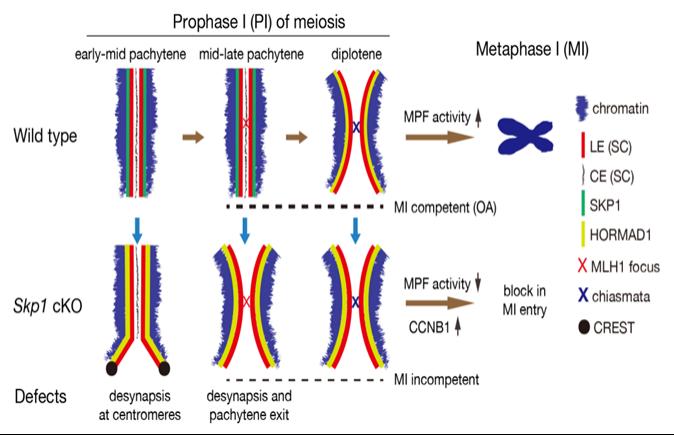罗孟成、Jeremy Wang团队发现SKP1位于减数分裂染色体联会区域,敲除SKP1导致雌雄小鼠均不育,粗线期染色体提前解离,无法进入减数分裂中期。进一步采用冈田酸处理,粗线期染色体仍然无法进入中期,这表明SKP1是减数分裂染色体获得进入中期能力所必须的一个调控因子。SKP1敲除小鼠模型是目前唯一一个具有提前解联会表型的小鼠模型。该论文从多个角度揭示了SKP1 在维持减数分裂联会和调控减数分裂I前期到中期转化的分子机制,为人类配子发生障碍的诊治提供理论依据。