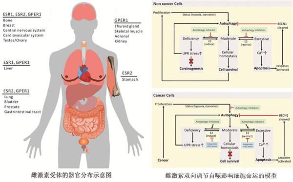 雌激素是一种性激素,通过雌激素受体介导发挥重要生理调节作用。该研究通过梳理雌激素效应与自噬这两者之间的交互关系,发现当受到雌激素刺激时,细胞可通过雌激素受体下游庞大信号网络中的诸多环节实施负向调节,实现促进自噬和限制过度自噬的双向作用,让细胞稳态得以维持。为了更好地理解雌激素对自噬的精细调节如何影响正常细胞以及癌细胞的命运,该研究创新性地提出了一个模型。该模型合理解释了细胞自噬与雌激素相关癌症致病及治疗机制之间的多重关联,解决了将自噬原理运用于雌激素相关癌症防治的瓶颈问题,构成了本项研究的核心内容,获得了国际同行的认可。