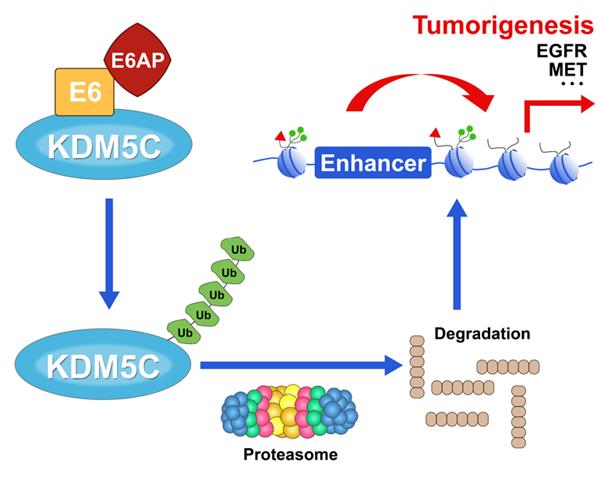 李枫课题组发现,HPV16 E6与组蛋白H3K4去甲基化酶KDM5C相互作用,导致后者以E3连接酶E6AP-和蛋白酶体依赖的方式被降解,并通过质谱的方式找到了其泛素化修饰位点。他们进一步研究发现,HPV16阳性的宫颈癌细胞系表现出比HPV16阴性的宫颈癌细胞系更低的KDM5C蛋白水平。KDM5C的恢复显著地抑制了HPV16阳性宫颈癌细胞系CaSki细胞的成瘤性。全基因组ChIP-seq和RNA-seq结果显示,CaSki细胞在原癌基因EGFR和c-MET中含有超增强子。通过表达KDM5C抑制这些超级增强子而敲低KDM5C则激活它们。