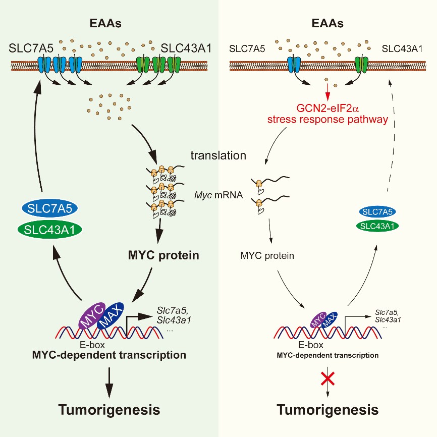 以往研究表明,许多SLC家族成员蛋白(例如SLC7A5/A8,SLC43A1/A2,SLC6A14,SLCA1-A11等氨基酸转运蛋白)参与摄取必需氨基酸;那么调控肿瘤代谢的关键癌蛋白Myc是否调节了上述SLC家族蛋白的表达?研究发现,MYC通过直接激活转录的方式特异性调控SLC7A5和SLC43A1的表达,增强肿瘤细胞对必需氨基酸的吸收。细胞内充足的必需氨基酸能够抑制GCN2-eIF2α-ATF4应激通路,继而促进eIF4F依赖的蛋白质翻译,选择性激活Myc、Bcl2、Cyclin D1等关键促癌蛋白的合成,形成Myc-SLC7A5/SLC43A1正反馈环路,最终导致肿瘤的恶性发展(见下图)。这项研究不但揭示了代谢异常促进肿瘤发生发展的新机制,而且为Myc高表达肿瘤病人的治疗提供了潜在的新靶点。