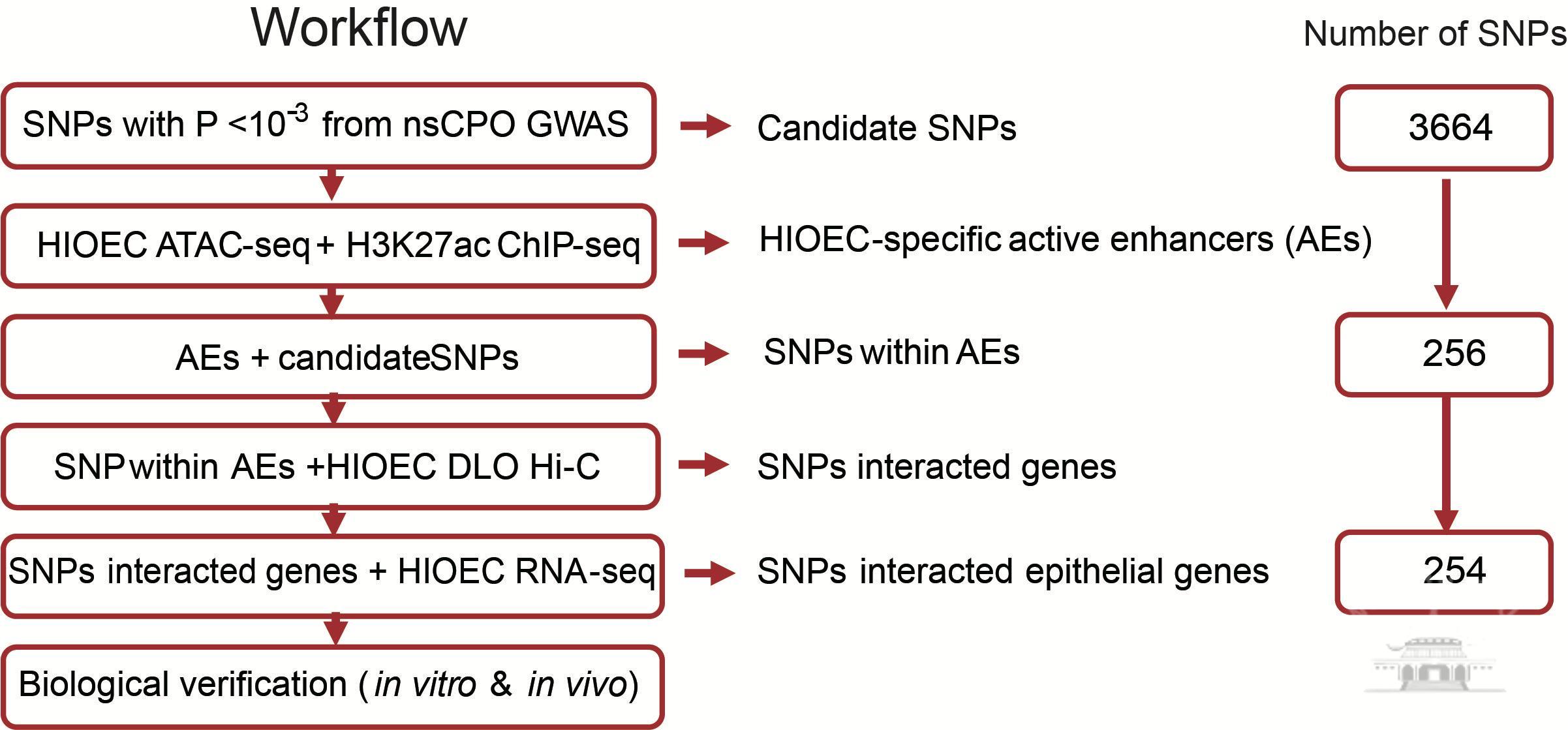 在本研究中,利用RNA-seq、ATAC-seq、H3K27ac ChIP-seq和DLO Hi-C获得了一个基于人口腔上皮细胞系(HIOEC)染色质构象的相对完整表观基因组数据集。据推测,该表观基因组数据集可以揭示口腔上皮细胞活性增强子/启动子中缺失的功能性变异及其风险靶基因,尽管与OFC的统计关联相对不那么严格。以中国汉族人群的非综合征性腭裂(NSCPO) GWAS数据为例,对3664个不能达到严格意义阈值的SNPs进行了该功能识别。