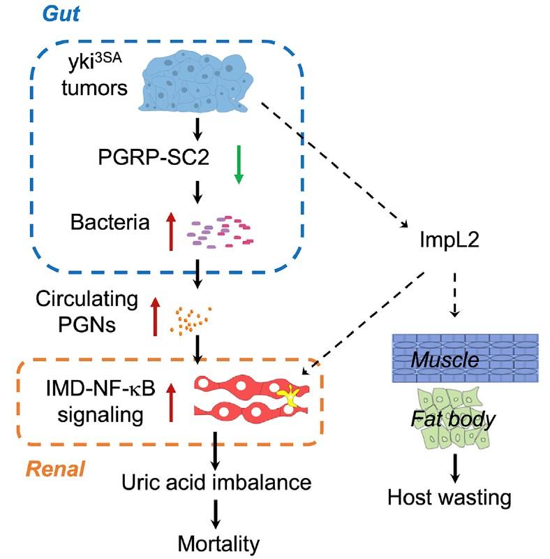 在本课题中,研究人员通过在果蝇肠道中过表达活化的转录因子yki3SA(人体YAP1同源物),诱导肠道干细胞过度增殖形成肠道恶性肿瘤,进而造成机体消耗和寿命缩短。利用该模型,研究人员发现yki3SA肠道肿瘤可特异抑制肠道中肽聚糖识别蛋白PGRP-SC2的合成、造成机体细菌过度增殖和系统性IMD-NF-κB免疫信号的过度活化,从而导致果蝇死亡,但不影响机体能量消耗,首次表明荷瘤机体的消耗和存活率可以相互剥离。此外,他们进一步发现果蝇马氏管(Malpighian tubules,果蝇的肾小管组织)中IMD-NF-κB免疫信号活化导致尿酸堆积是造成yki3SA荷瘤果蝇死亡的关键因素。之前课题组发现一种重要的肿瘤分泌蛋白ImpL2,也可以部分通过肾脏尿酸代谢导致机体死亡(图1)。重要的是,大规模的人群队列研究也发现高血尿酸(>400 mM)是多种癌症患者死亡率的重要独立风险因子。