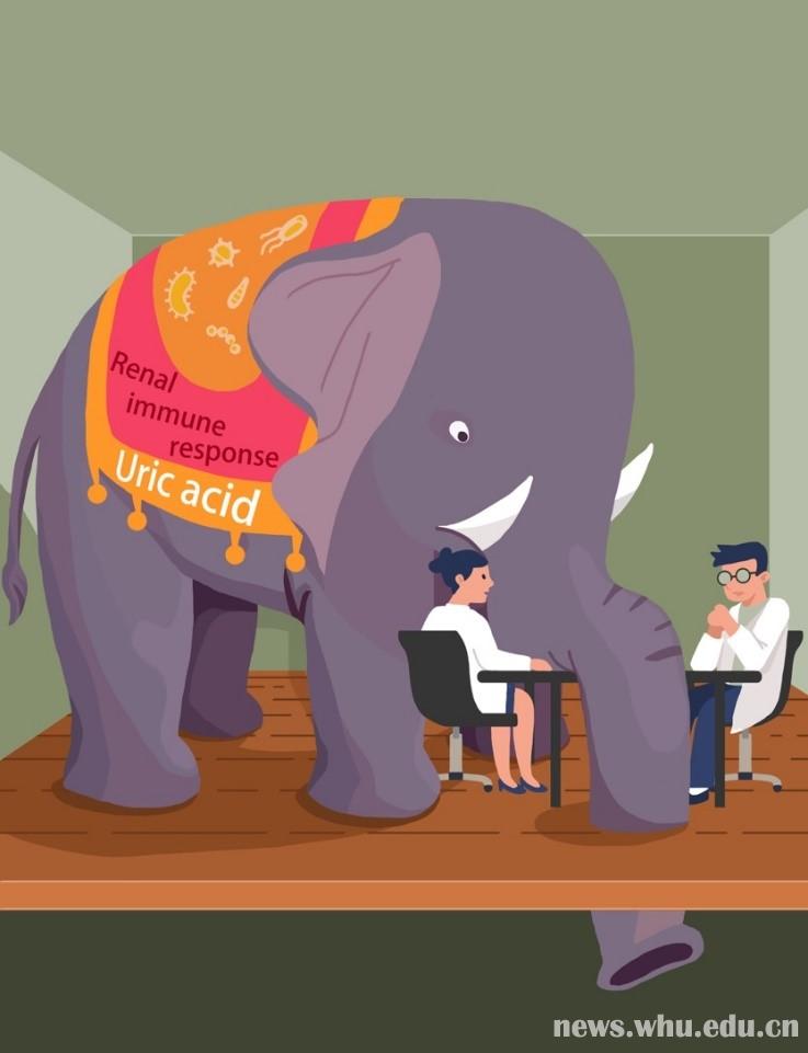 因此,该研究发现环境微生物、肠道细菌、肾脏IMD-NF-κB免疫反应和尿酸代谢是恶性肿瘤导致机体死亡的重要因素,且独立于目前已知的肿瘤相关的机体消耗,为深入理解肿瘤-宿主互作、实现荷瘤生存提供了新的角度。鉴于生物体在自然界中不可避免地接触外在环境,因此外界微生物、肠道菌群、肾脏免疫反应和尿酸代谢实属“房间里的大象”(图2),会在肿瘤以及其他疾病发生发展中发挥重要的作用。