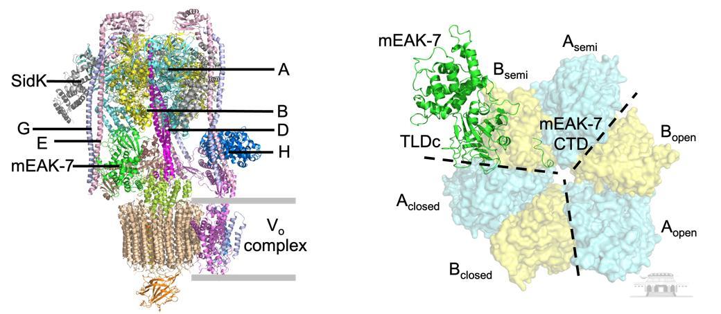 为了鉴定V-ATPase结合伙伴,作者基于从HEK293细胞中纯化的人V-ATPase的大型冷冻电子显微镜数据集,行了多轮分类和重点细化。通过结构分析、人工智能建模和质谱验证,作者发现mEAK-7与状态2下的V-ATPase中的V1复合体紧密结合。进一步分析表明,mEAK-7与状态2中的V-ATPases的亚基A、B、D和E相互作用。由于mEAK-7参与了哺乳动物mTOR信号转导,作者提出mTOR和V-ATPase的功能具有紧密联系,并且mEAK-7可能通过结合状态2下的V-ATPases来调节V-ATPase功能,并介导mTOR信号转导。