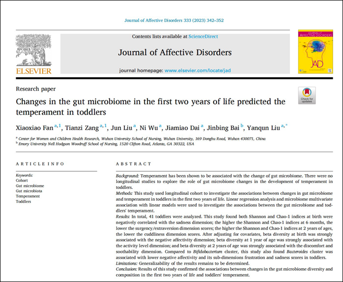 近日,我院刘燕群课题组在《Journal of Affective Disorders》期刊上发表了关于生命早期前两年肠道菌群变化和幼儿气质之间联系的最新研究进展。该论文题目为“Changes in the gut microbiome in the first two years of life predicted the temperament in toddlers”。快猫短视频