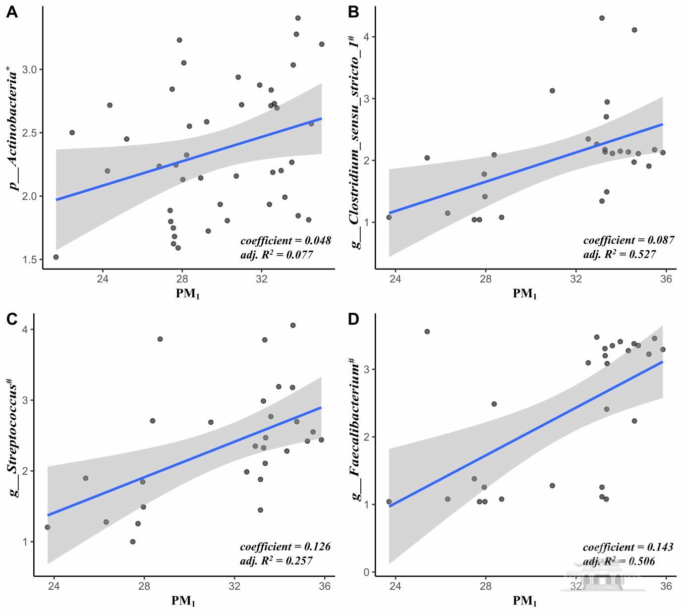 相比之下,妊娠期PM1暴露对母亲肠道微生物群的α-和β-多样性没有影响。在群落组成方面,妊娠期PM1暴露与母亲肠道菌群的放线菌门和新生儿肠道菌群的Clostridium_sensu_stricto_1、Streptococcus以及 Faecalibacterium菌属呈正相关(图2)。这些发现首次提供了妊娠期PM1暴露与母亲和新生儿肠道菌群之间存在重要关联的证据,为未来从环境风险因素角度进行母婴特别是胎儿宫内发育的保健管理提供了理论依据。