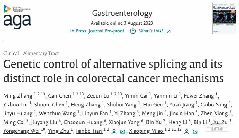 新闻网讯(通讯员田剑波、樊杰)近日,公共卫生学院教授缪小平/田剑波团队在Gastroenterology(IF: 29)在线发表了题为“Genetic control of alternative splicing and its distinct role in colorectal cancer mechanisms”的研究论文。