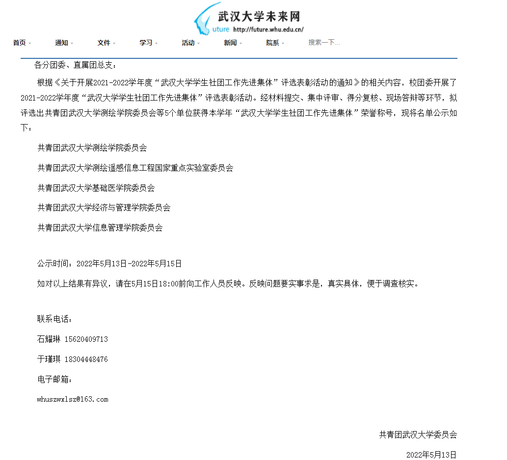 2021-2022学年度“学生社团工作先进集体”考核评优工作结束,经材料评审、线下答辩两个环节,我院以第三名的成绩获此殊荣。