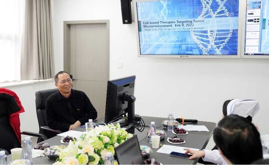 研讨会上,杨美家教授以“Cell-Therapies Targeting TME For Cancer Treatment”为题做了研究项目报告,展示了研究院和他本人在肿瘤细胞治疗方面的研究成果和该领域最新的发展动态,并引出了多方合作项目的热点话题。与会专家现场就合作项目诸多细节展开了热烈的讨论,并对各参与单位、各团队如何交叉融合,科学、规范地推进项目进程交换了意见并达成共识。
