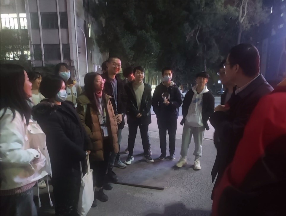 由于问题众多,班会讨论一直持续到教室关门,还有同学存在疑惑,希望得到解答。陈辰老师在这时提出将疑惑带到教室外继续解答。借着微弱的灯光,师生们来到教学楼屋檐下。陈辰老师体贴地提醒同学们:如果疑惑已经得到解决,可以回宿舍休息。然而,几乎没有同学离开——大家都希望能多聆听陈辰老师的宝贵教诲。班会结束时,同学们一齐走在灯光昏黄的校园里,却感到未来的路更加清晰明亮了。