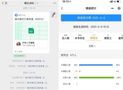 疫情防控常态化工作不动摇。疫情期间建立以课题组为单位的防疫小组,现已常态化管理,每个小组由组长负责并汇报组内学生每日在校及健康状况,确保及时掌握每一名学生动态。此外,辅导员、班级导师和兼职辅导员每日定时督促学生小程序打卡,协同育人,从多方位了解学生的健康状况。