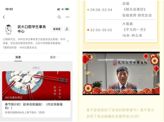举办线上新年晚会。根据学院疫情防控工作的安排,今年我院新年晚会云端举办。院领导、老师为学生拍摄祝福视频,并在全院学生中征集节目及节日祝福。历时两个月的节目准备、审核、拍摄及后期制作,我院2021年线上春节晚会于2月5日农历小年在公众号“武大口腔学生事务中心”上线,给全院师生送上新年祝福,展示我院学子风采,丰富学生的精神生活。