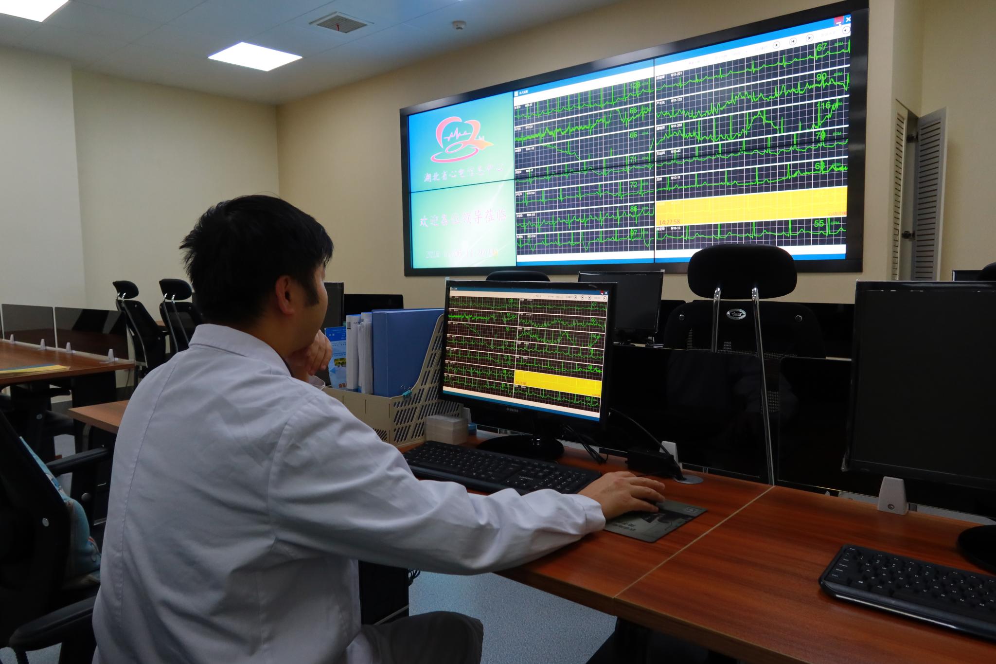2016年开始的“基于大数据的可穿戴心电监护和预警系统的构建与应用”项目中,心血管疾病患者可在医生指导下,使用一种仅重39克的“佩戴式”远程实时动态心电监测设备。患者的心电信息可通过蓝牙及手机网络,直接远程发送到湖北省人民医院的医生工作站,并永久保留在互联网云端,避免了常规心电图难以捕捉到患者偶发的异常心电信息和难以保存的弊端。如监测到不良心电活动,“佩戴式”设备会自动报警;患者如自觉不适,也可手动“一键报警”。医生站及大数据中心总部都会自动收到“危急值”提醒和患者的手动报警,以利于医生及时捕捉异常心电活动并指导诊断治疗。