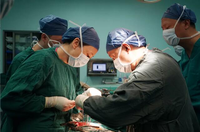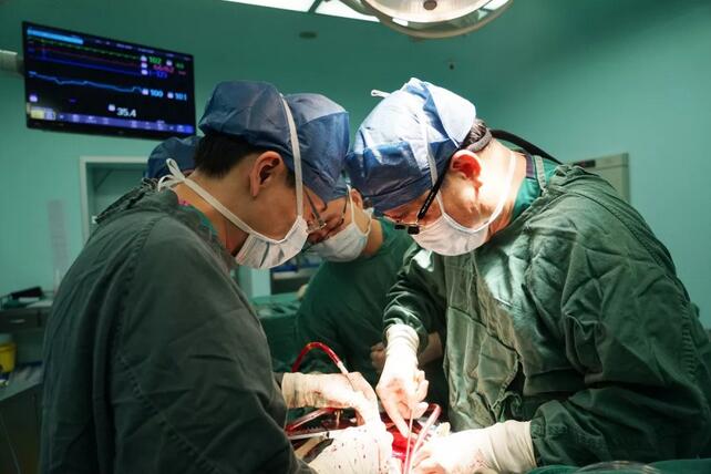 56岁的终末期心脏病患者刘老汉接受心脏移植手术。历时4小时,心血管外科王志维教授心脏移植团队,在麻醉医生雷凡副教授团队的默契配合下,快速摘除几乎已经失去作用的原有心脏,将健康的心脏植入,同时将各个主要血管严密缝合。