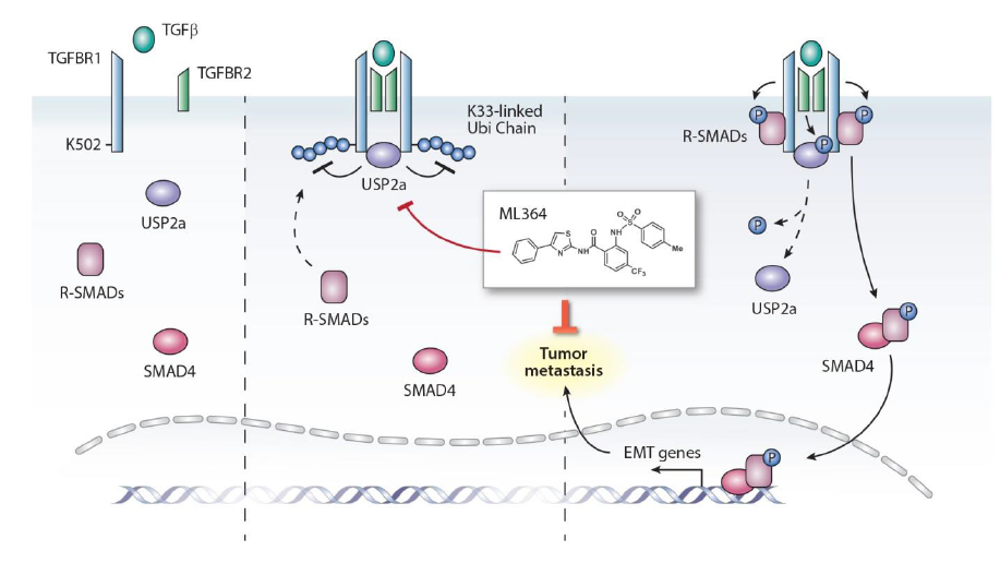 肿瘤转移是导致恶性肿瘤病人死亡的首要原因,研究表明TGF-b能促进肿瘤细胞发生上皮间质转化(epithelial-to-mesenchymal transition,EMT),在肿瘤细胞从原发灶脱离进入淋巴血液循环并形成转移灶的过程中起着关键作用。在TGF-b刺激下,TGFBR1/2形成异源四聚体复合物,并进一步招募并磷酸化SMAD2/3,SMAD2/3随后从TGFBR1/2上解离下来,与胞浆中的SMAD4结合进入细胞核,调控下游基因的转录。然而,SMAD2/3的招募和解离的精细调控机制及其生理病理上的意义尚不清楚。该论文报道了TGFBR1上一个新的泛素化修饰——Lys502上K33-链接的泛素化修饰,这一修饰抑制了SMAD2/3的招募。去泛素化酶USP2a通过去除Lys502位K33-链接的泛素链,促进SMAD2/3的招募与磷酸化。同时,TGFBR2磷酸化USP2a第207和第225位丝氨酸,使USP2a以及SMAD2/3更易于从TGFBR1/2复合物解离下来,从而促进TGF-b诱导的EMT相关基因的转录。相应地,敲低或敲除USP2a或通过小分子抑制剂抑制USP2a表达能显著抑制TGF-b刺激后SMAD2/3的招募与磷酸化以及EMT相关下游基因的表达,进而抑制肿瘤细胞的肺转移,暗示USP2a是一个潜在的药物靶点,靶向USP2a有望为转移性肿瘤提供新的治疗策略。
