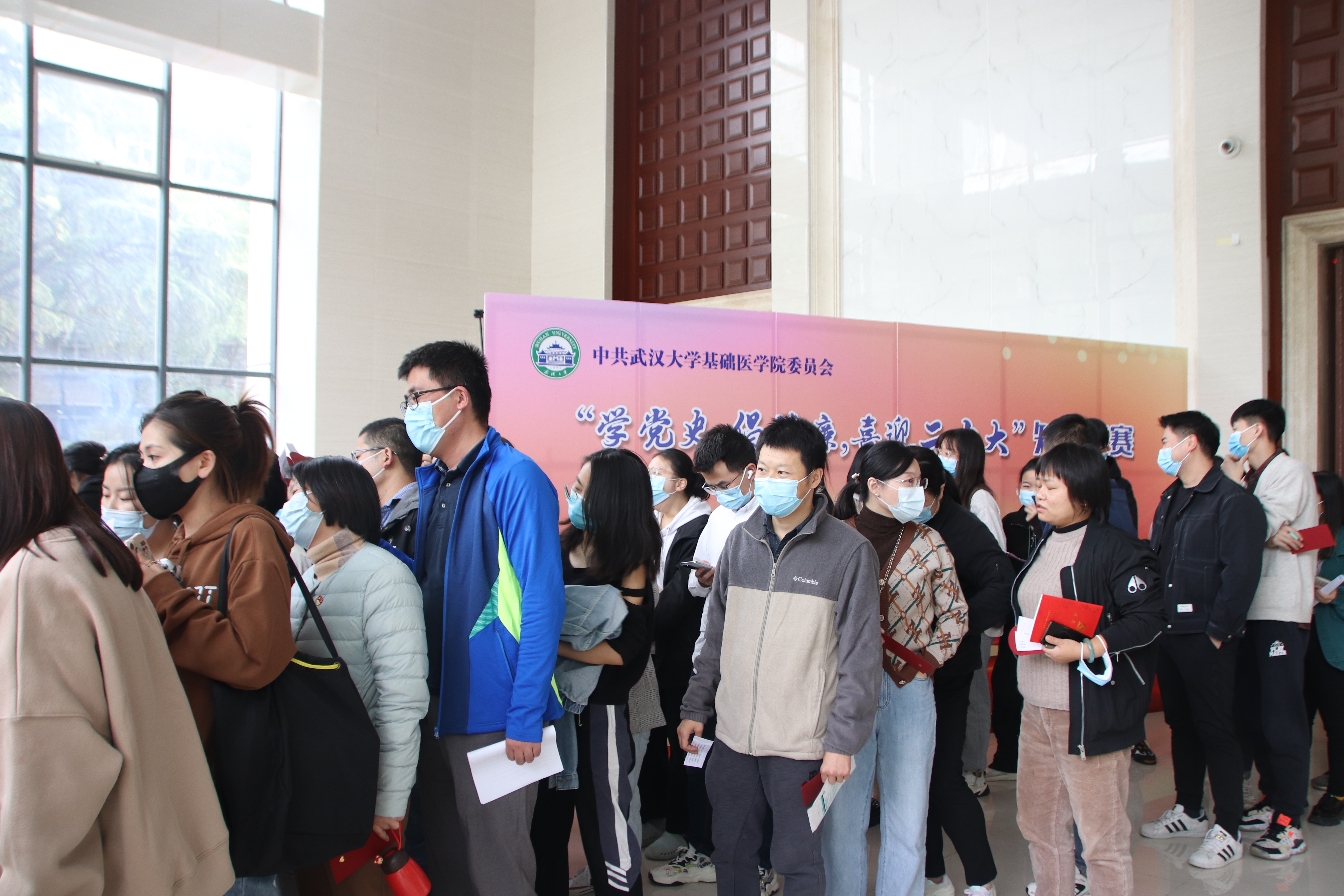 观看完宣传警示片,大家前往报告厅门口参加知识竞赛活动。知识竞赛以党史和党章党规为考题内容,设有100道题目,每道题目提前单独装在红包中,并粘贴在抽题墙上, 每道题目都设有相应的奖项。大家在抽题墙随机抽取红包,回答红包中的问题,随后找工作人员核对答案,答对后即可在兑奖区兑换奖品。大家兴致颇高,摩拳擦掌,100个红包很快被一抢而空。“在中国传播马克思主义的杰出代表、《我的马克思主义观》一文的作者是谁?”“中国共产党人的初心和使命是什么?”“对党员的纪律处分种类有哪些?”……大家在开心愉悦的氛围中一起重温党史知识,回顾党的规章制度。