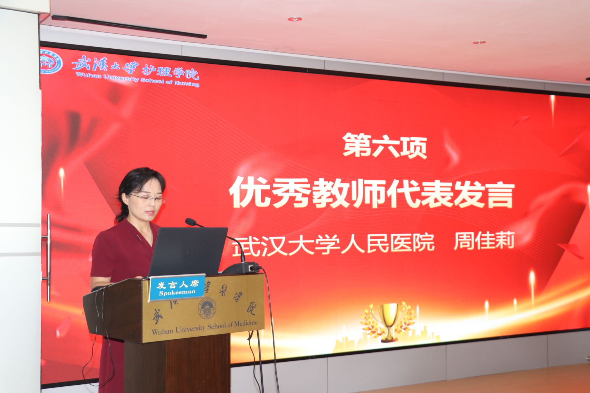 中南医院殷磊与优秀学生代表2021级本科生李靖怡发言。两位临床带教老师结合自己切身的带教经历,陈述了自己对师德一词的理解,21级本科生李靖怡代表全体学生向所有教师表示衷心谢意并祝以真挚的节日问候。