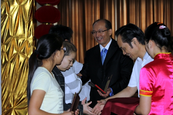 杨炯副部长为获奖同学颁奖。获得09年“廖康雄奖学金”的同学是:2006级临床医学八年制余小梅、2005级临床医学七年制佘乾燕、2006级临床医学五年制易新成和李艳萍。这四位同学专业课程均分超过90分,英语均以高分通过国家六级。
