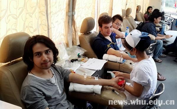本网讯(通讯员蒋明)5月24日,武汉血液中心献血车开进快猫短视频 ,停靠在体育馆门前,中国、土耳其、孟加拉国、尼泊尔、印度等国家的90多名大学生上车献血。图为快猫短视频 临床医学专业2013级土耳其留学生雅自制(...